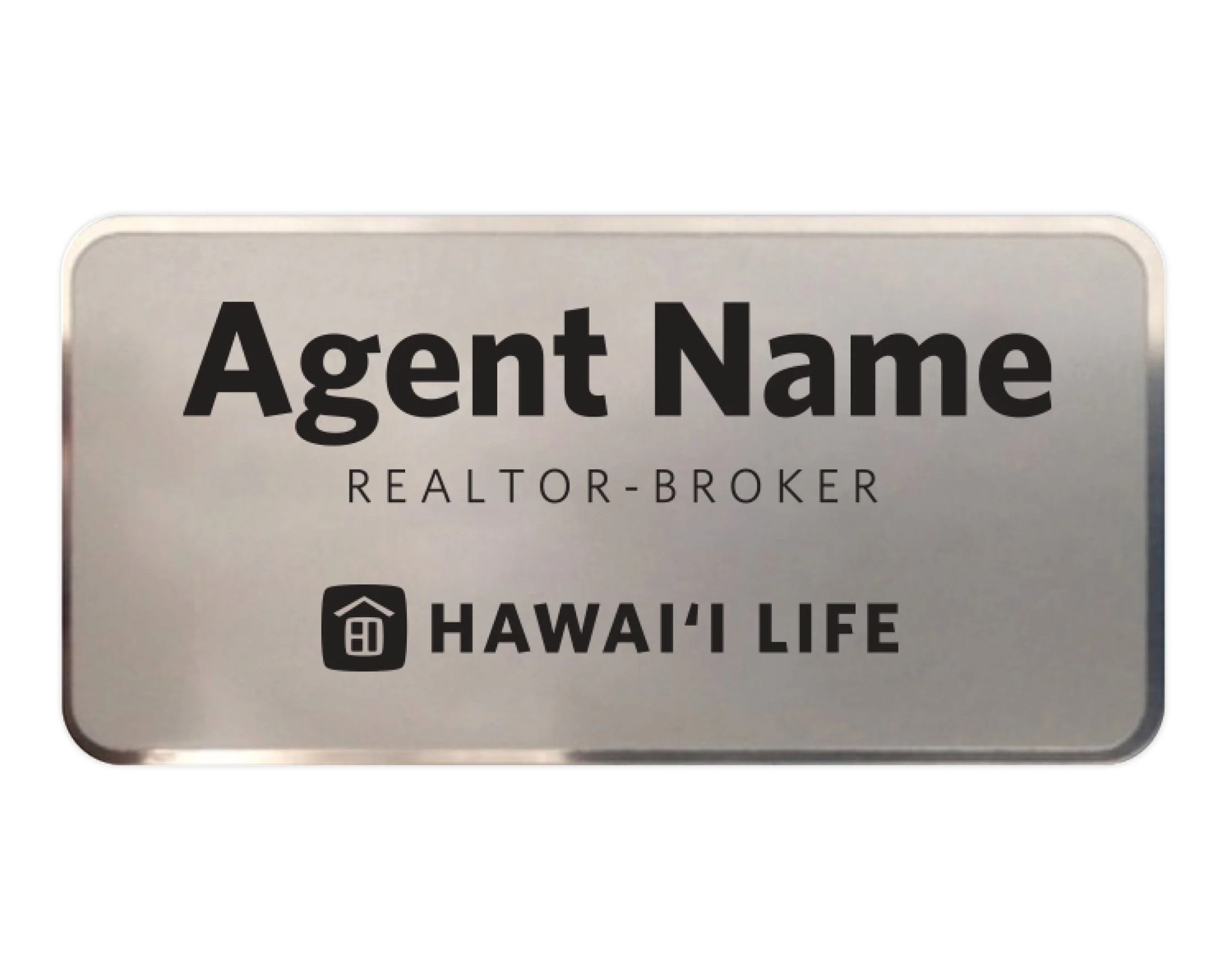 Hawai‘i Life name tags which are designed for readability and brand recognition and are printed with black ink on a silver surface with a magnetic attachment.